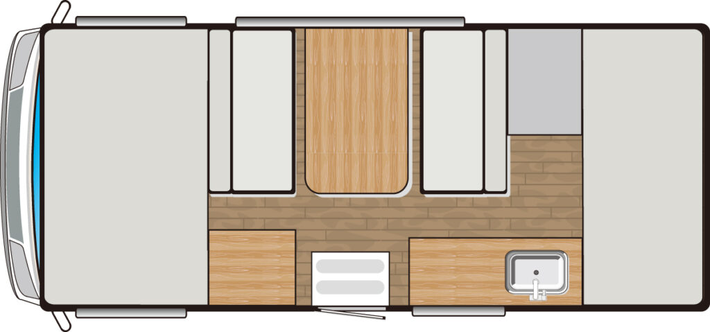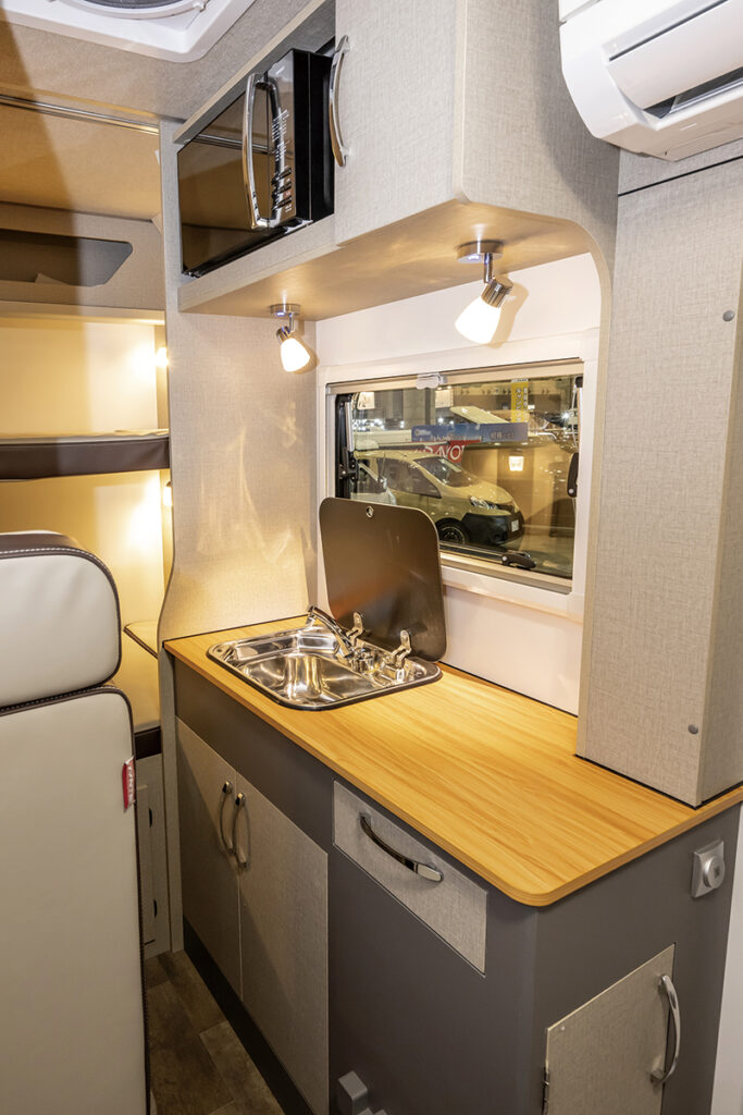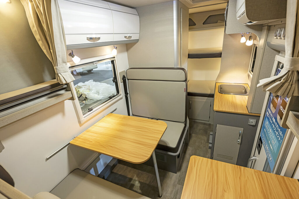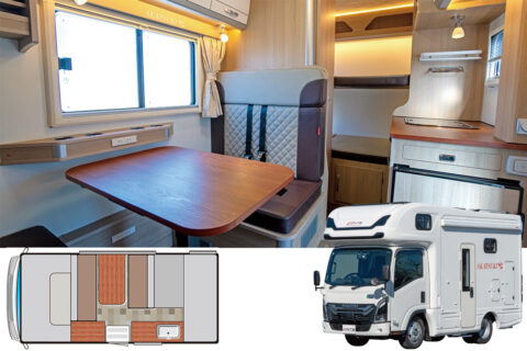 何といってもそのサイズが最大の特徴で、全幅1800mm未満で最小回転半径はわずか4.4m。その数字だけ見ても、運転への不安はなくなるはず。また、超軽量に仕上げられた車体構造が軽快な走りを約束し、移動時の疲労も激減する。日本特種ボディーのカガヤキのOEMだが、木目調の家具や明るいトーンを用いており、まったく違ったモデルの印象。リヤベッドは長さこそ1650mmだが、幅は795mmと十分なスペースが用意されているのもかなり好印象だ。ダイネットまわりは、スペースを稼ぎ出す工夫が随所に。7人乗車に6人就寝を実現するため、バンクベッドとフロアベッドの上下の重なりなどには工夫がなされている。装備はシンプルで過剰にならないようまとめてある。