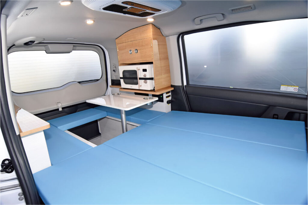 さらにルーフクーラーを標準で装備するほか、リチウムイオンバッテリーに高出力インバーター、電子レンジも備える。ミニバンならではの走りのよさや使い勝手はそのままのお手軽車中泊仕様なのだ。