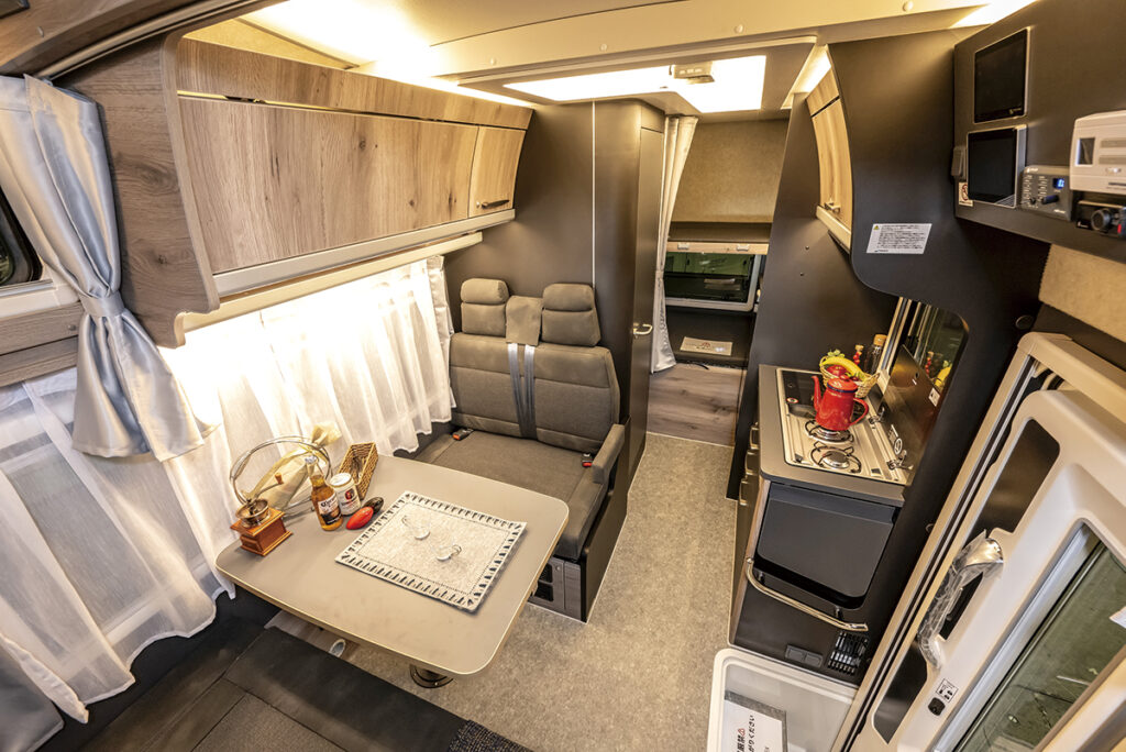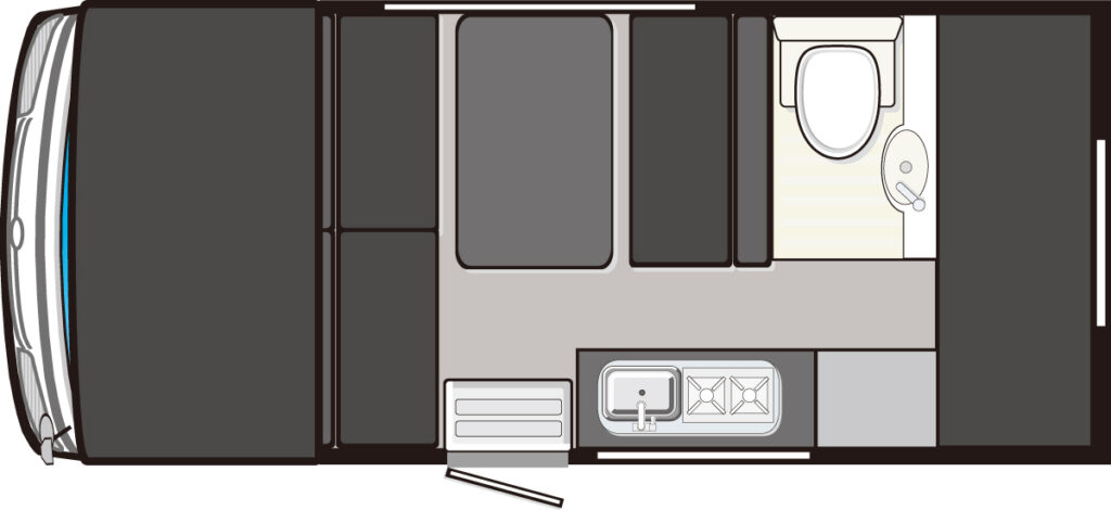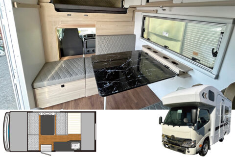 | 標準装備 | 2口コンロ/電子レンジ/85ℓ冷凍冷蔵庫/63ℓ給水タンク/75ℓ排水タンク/ルームエアコン/FFヒーター/200Ahリチウムイオンサブバッテリー ほか |