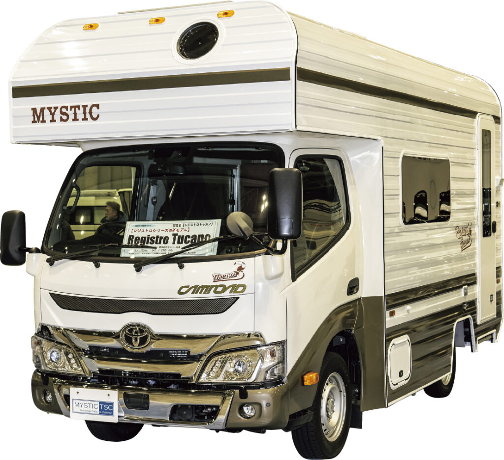 丸みを帯びたルーフ形状は、ミスティックのお家芸。アルミサイディングパネル工法を採用し、その愛らしいスタイルが人気。これまでのレジストロシリーズは小型モデルだったのだが、ついにカムロードベースのキャブコンも登場した。このシェル構造は軽量で断熱性にとみ、車幅が1870mmにまで抑え込まれているので、運転も楽。内外装とも、何となくレトロというか懐かしい雰囲気。