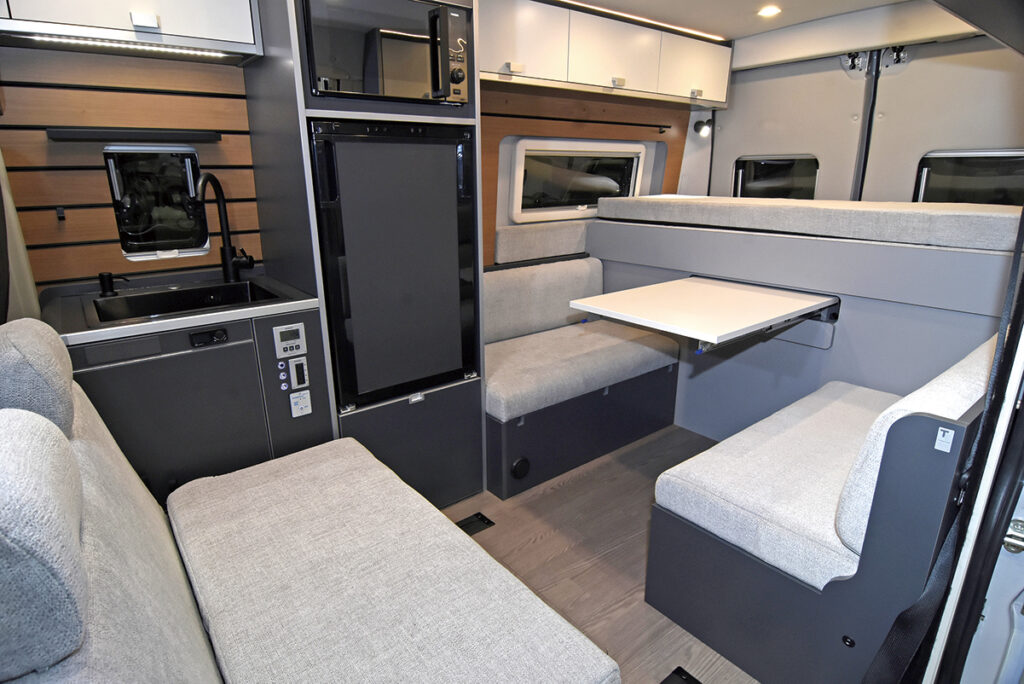 人数や状況に応じて、前向きにした2列目シートとフロント回転シートで作るフロントダイネット、後ろ向きにした2列目シートと後部シートで展開するリヤダイネットの2通りにアレンジ可能。