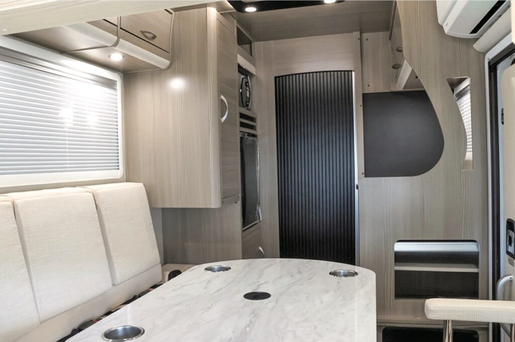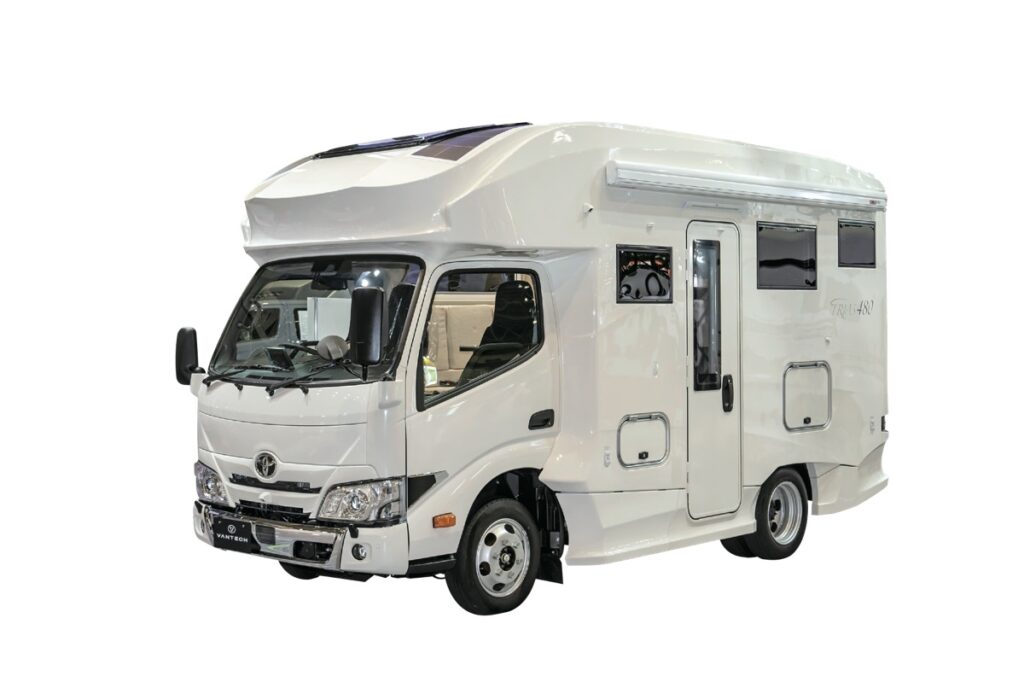 リチウムイオンサブバッテリーやルームエアコンも標準装備。断熱性能を高めたFRP一体成形の車体構造により、寒冷地でも車内を暖かく保ち、夏場の厳しい暑さでも快適。キッチンの背面に冷蔵庫と電子レンジを配置している。