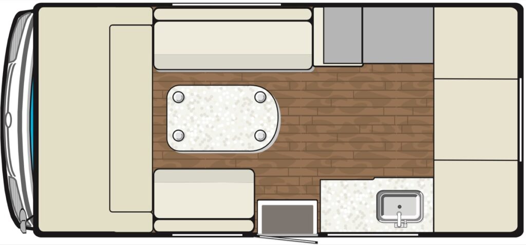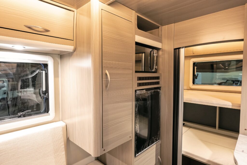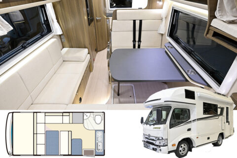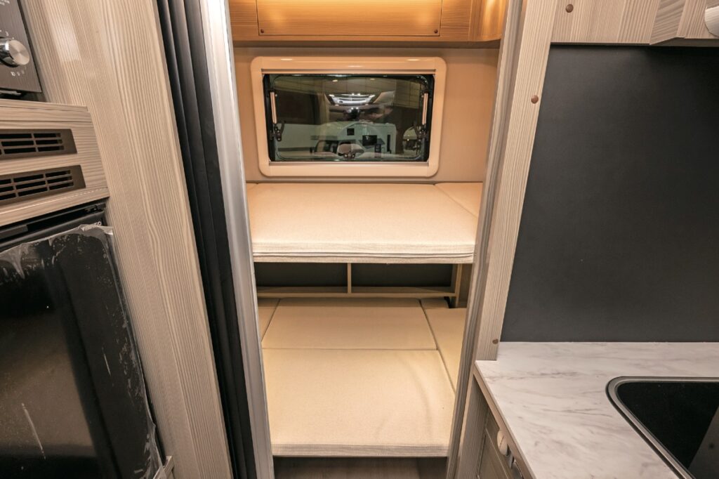フル装備といって問題ないレベルでありながら、サイズはコンパクトにまとめられた。バンクベッドは大人1人分、または子供2人分の就寝定員を確保。オプションで、天井部にはスカイビューウィンドウの選択が可能だ。