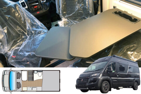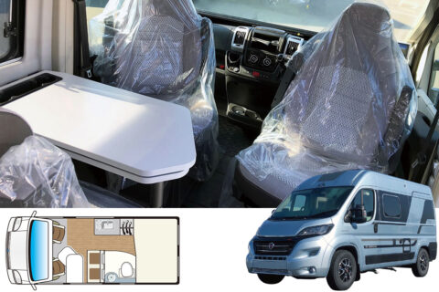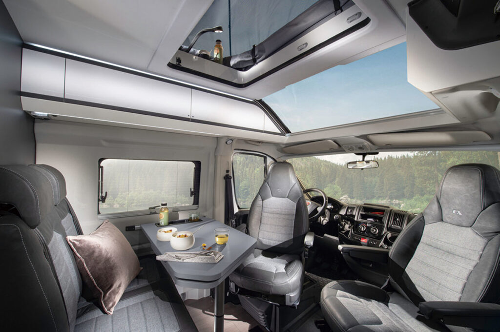 回転させたフロントシートとセカンドシートで作るダイネット、可変式シャワー&トイレルームなど定評の装備に加え、電動で高さを変えられるリヤ常設ベッドを設定。