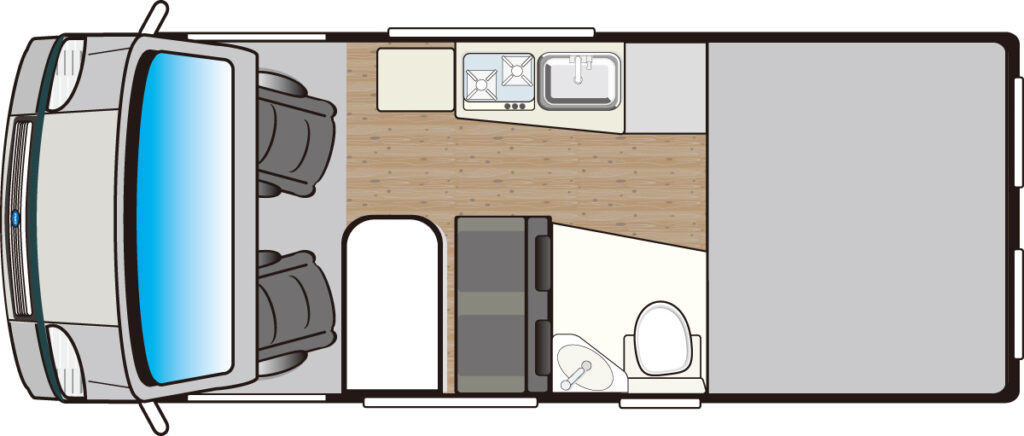 | 標準装備 | コンロ/200Ah鉛サブバッテリー/1ウェイ・138ℓ冷蔵庫/トイレ/FFヒーター/100ℓ給水タンク/70ℓ排水タンク ほか |