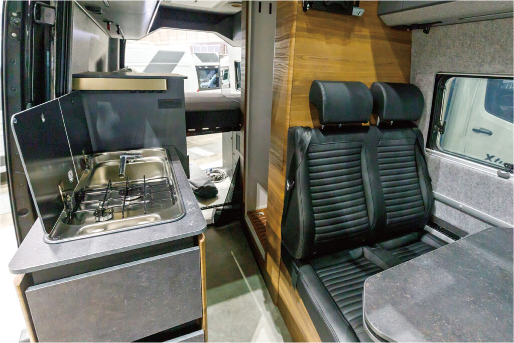 写真は全長が約6mの600SPBだが、7m級の700GSXのラインナップもあり、こちらは後部ベッドが電動昇降式となっている。全てのモデルに開閉式パノラミックウィンドウとルーフウィンドウを標準装備し、車内に明るい自然光が差し込む設計。