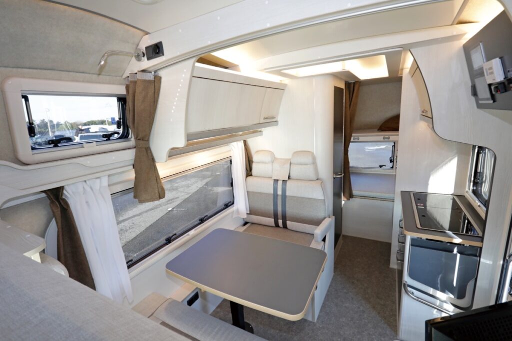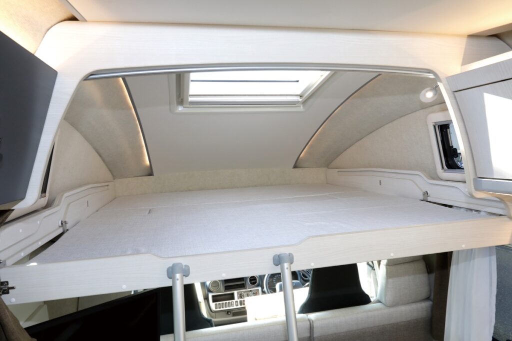ルーフパネル、サイドパネル、フロアにはXPS断熱材を使用。高断熱ボディの車内に床暖房を採用するなどこれまでの国産キャブコンの装備類とは格段の違いを見せる。