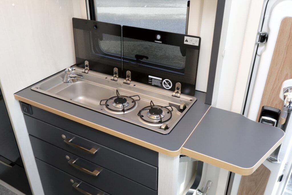 ガラスカバー付きの2口シンクと容量のある収納を備える。