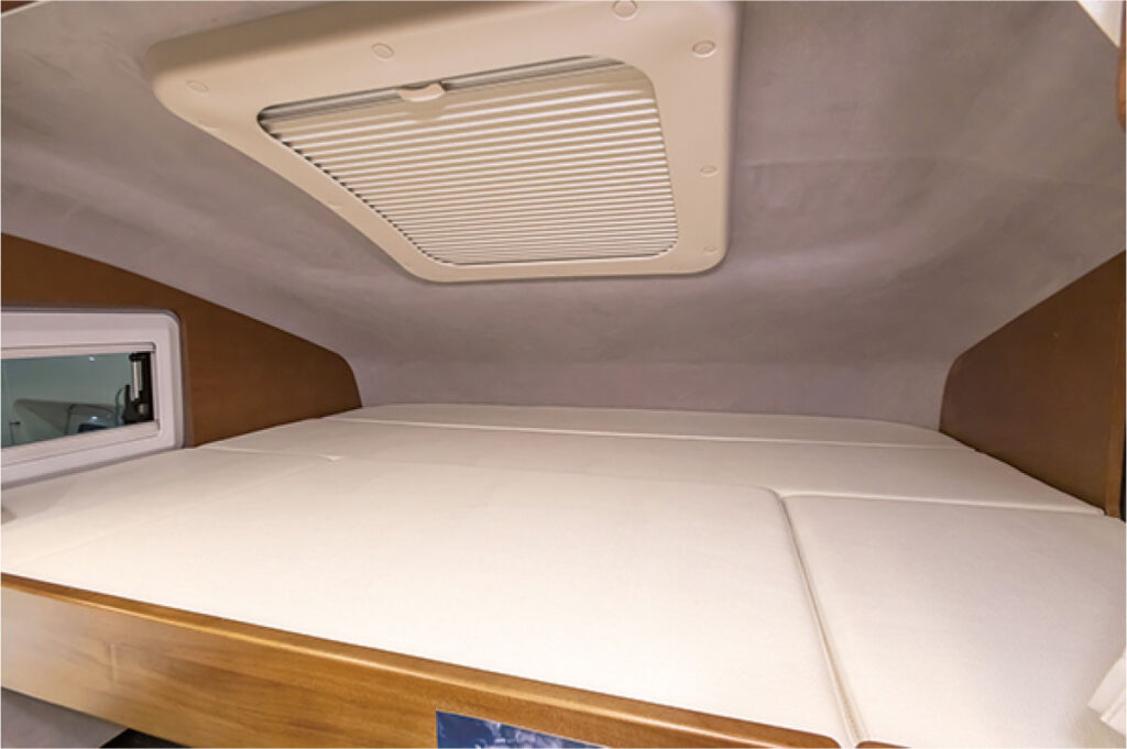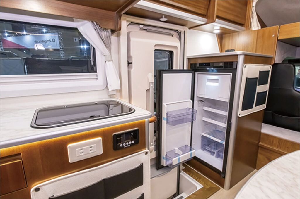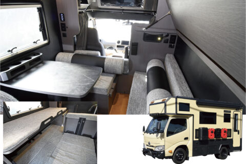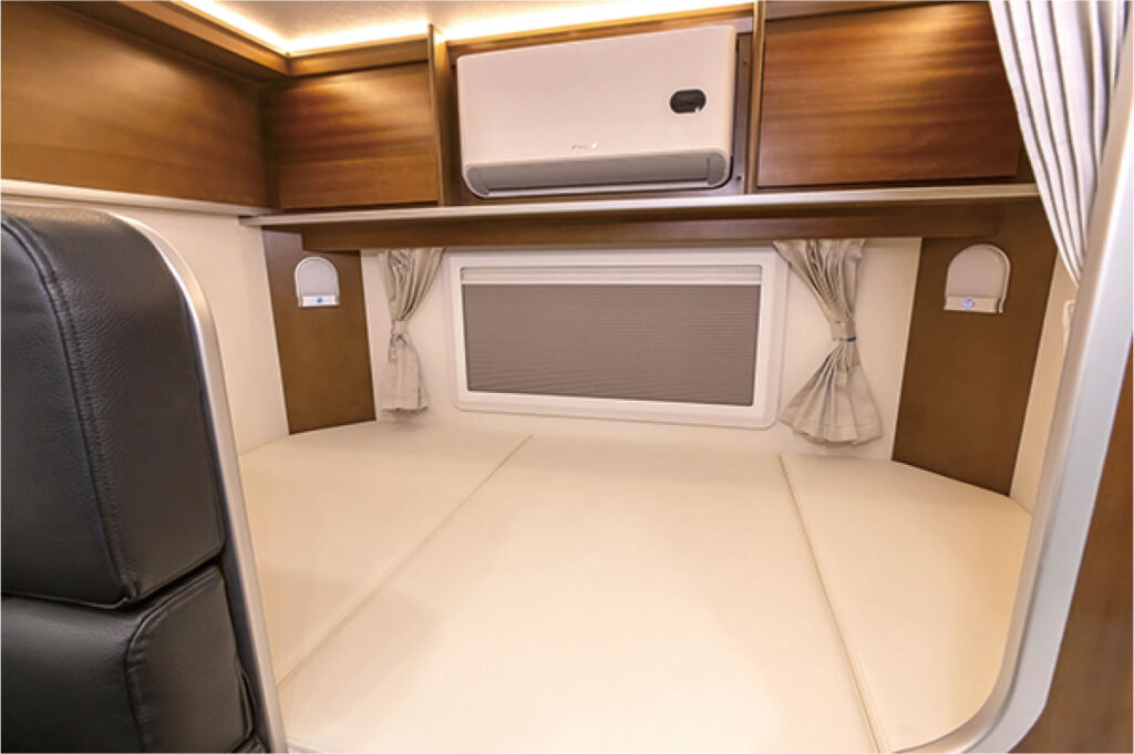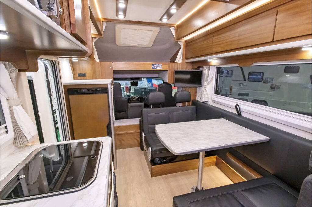 車室内は前方に対面ダイネットとキッチン、後部に常設ベッドを配したキャブコンではスタンダードなレイアウト。あえてマルチルームレスとすることでセカンド&サードシートの配置にゆとりを持たせ、リヤベッドも大人2人がゆったり就寝できる広々としたスペースを確保している。