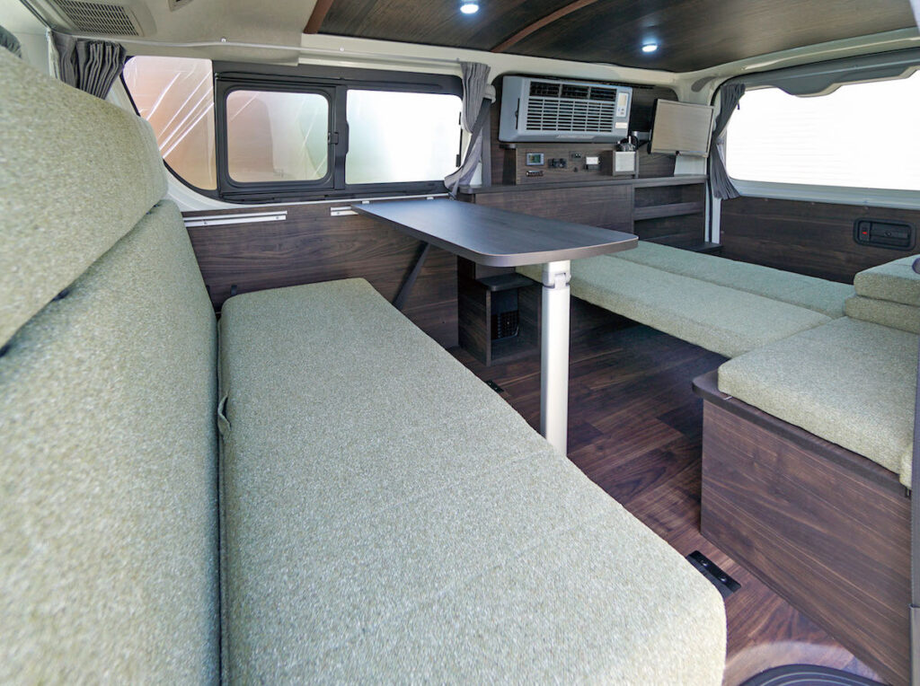 後部のベッドマットは常設としてダイネットに利用できるほか、左サイドにまとめるのも可能。荷室の確保も容易で、長尺物や自転車の積載も余裕なのだ