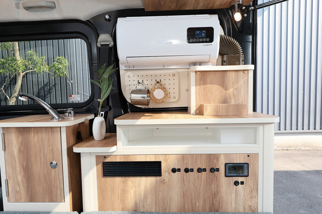 上部棚と右キャビネットに収納を集約。さらに、キャビネットの隣にはオプションで着脱式のシャワーボックスも用意。これがあれば、キャンプやマリンスポーツで活躍。DC12Vクーラーは標準装備。