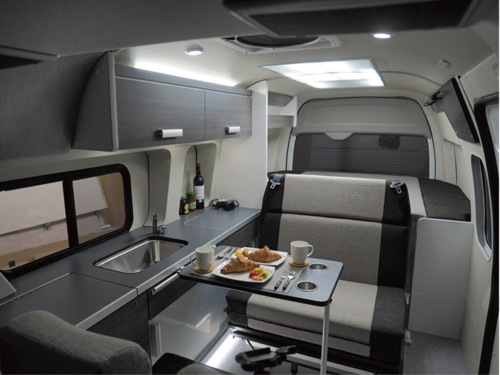 | 標準装備 | カセットコンロ/シンク/電子レンジ/2ウェイ・49ℓ冷蔵庫/15ℓ給排水タンク/FFヒーター/105Ah鉛サブバッテリー×2/2000Wインバーター/200Wソーラーパネル ほか |