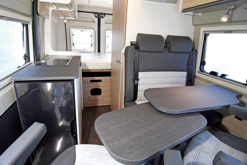 日本の道路事情に適した全長5410mmの右ハンドル仕様。ブラック×グレーの合皮シートと明るい木目調家具の組み合わせでスタイリッシュな空間を演出。回転させたフロントシートとセカンドシートでテーブルを囲む。