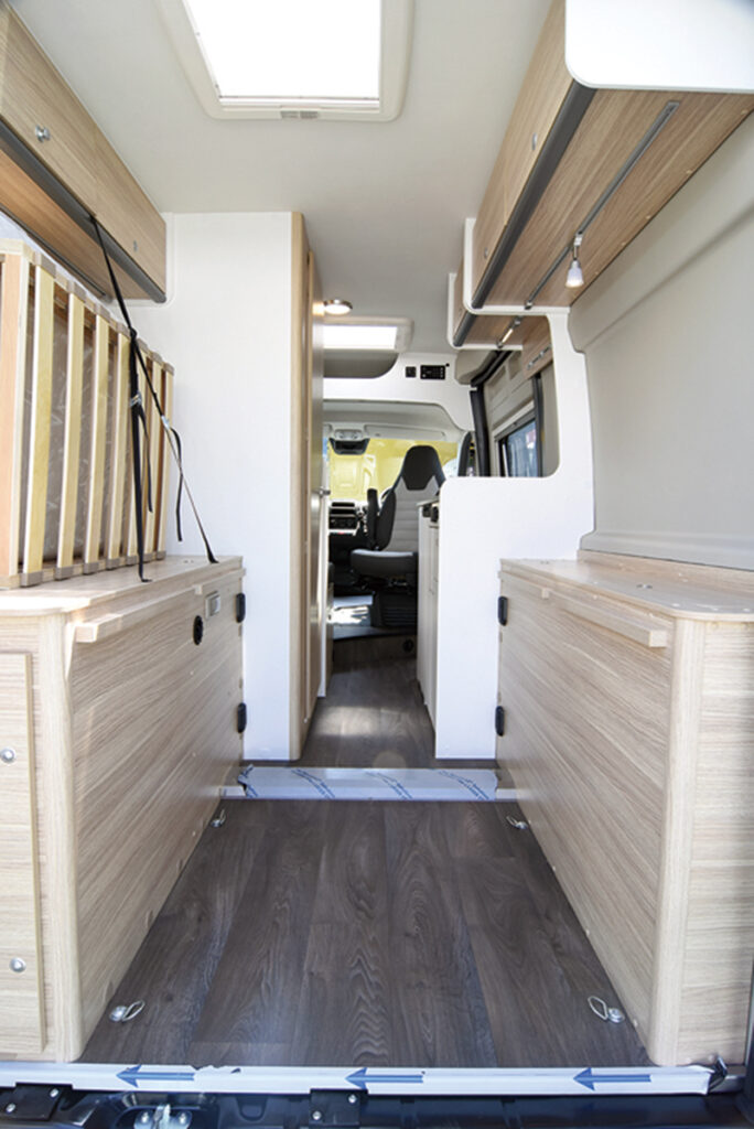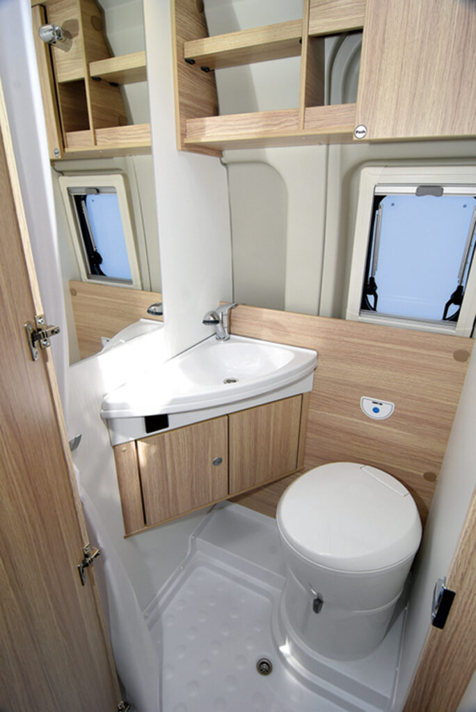 コンパクトサイズながら広いシャワー&トイレルームを備え、ガス式の温水ボイラーとFFヒーターも標準装備。スライドドア横はキッチンスペースで、84ℓ冷蔵庫、シンク、コンロをビルドイン。