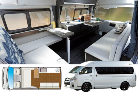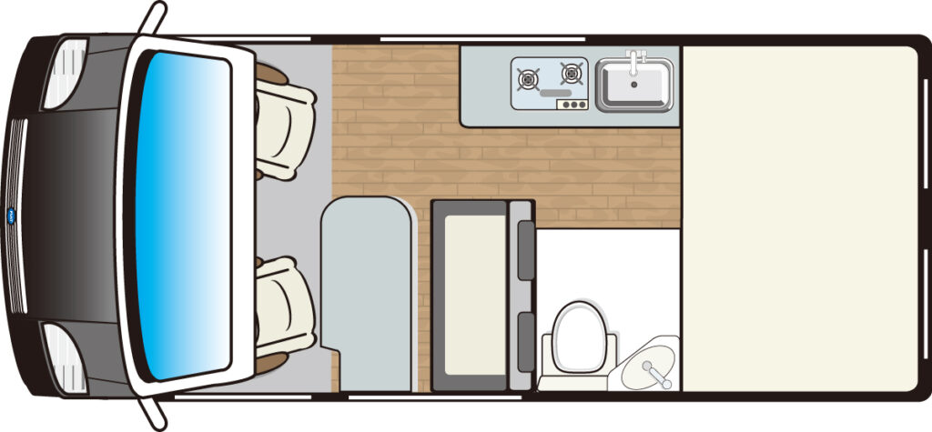 | 標準装備 | 2口コンロ/1ウェイ・84ℓ冷蔵庫/95Ahサブバッテリー/トイレ(カセット式)/FFヒーター/100ℓ給水タンク/90ℓ排水タンク ほか |