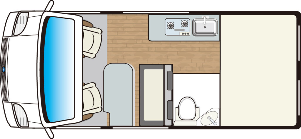 | 標準装備 | 2口コンロ/84ℓ冷蔵庫/100ℓ給水タンク/90ℓ排水タンク/FFヒーター/トイレ(カセット式)/95Ahサブバッテリー ほか |