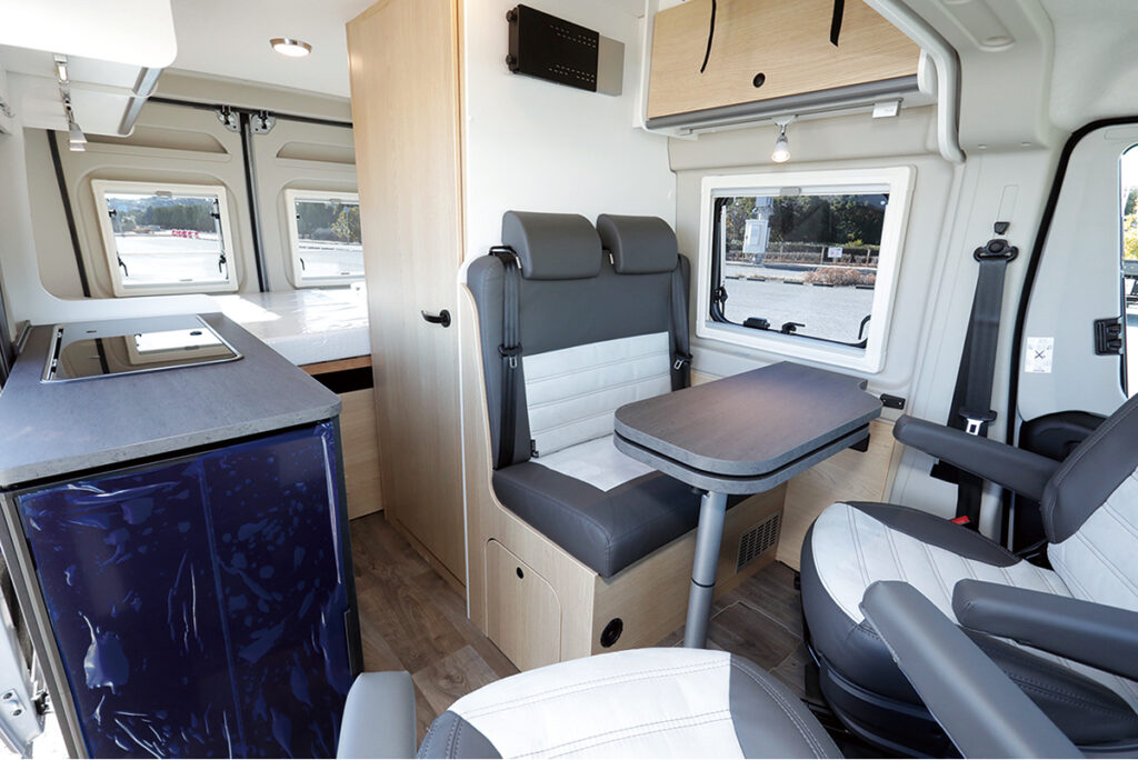 ダイネットは反転したフロントシートとセカンドシートで形成し、その後方にはトイレ&シャワールームとキッチンをレイアウト。リヤベッドの下が、大きなカーゴスペースになっているのもうれしい。