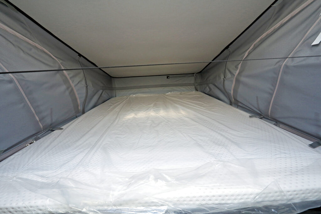 ポップアップルーフの採用で、4人分の就寝定員を確保。ルーフとリヤの2カ所にあるダブルベッドで、ファミリーユーザーでもゆったりと車中泊を楽しめる。ポップアップルーフのフロントとサイド部分がフルオープン&網戸になるのもポイントだ。