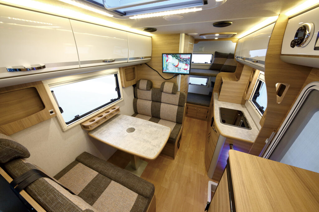 温水装置や2口コンロ、冷蔵庫、電子レンジ、エアコンと旅に便利なアイテムは標準。独自開発のハイパフォーマンスハイブリッドシステムには、4個のリチウムイオンバッテリー、走行充電システムと465W ソーラー付き。