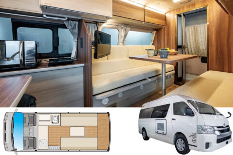 オプションのフロントシート回転機構を使うと、セカンドシートと対面ダイネットを作れる。セカンドシートはバタフライ式。スライド機構が備わり荷室を拡張できる