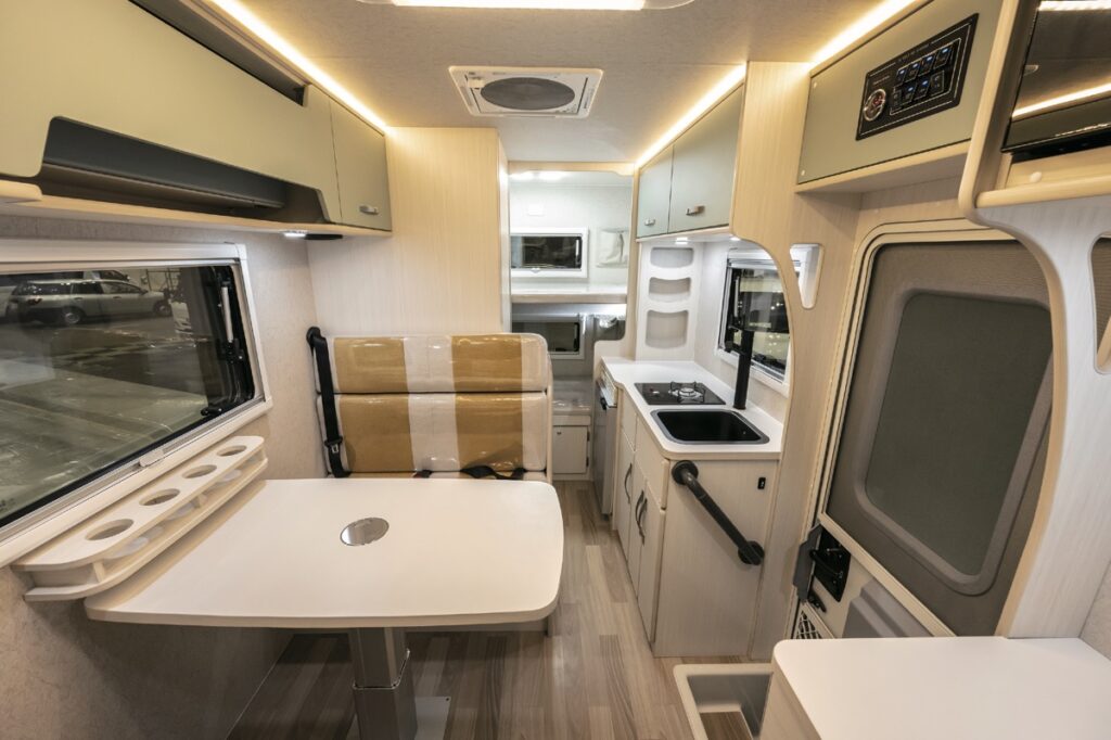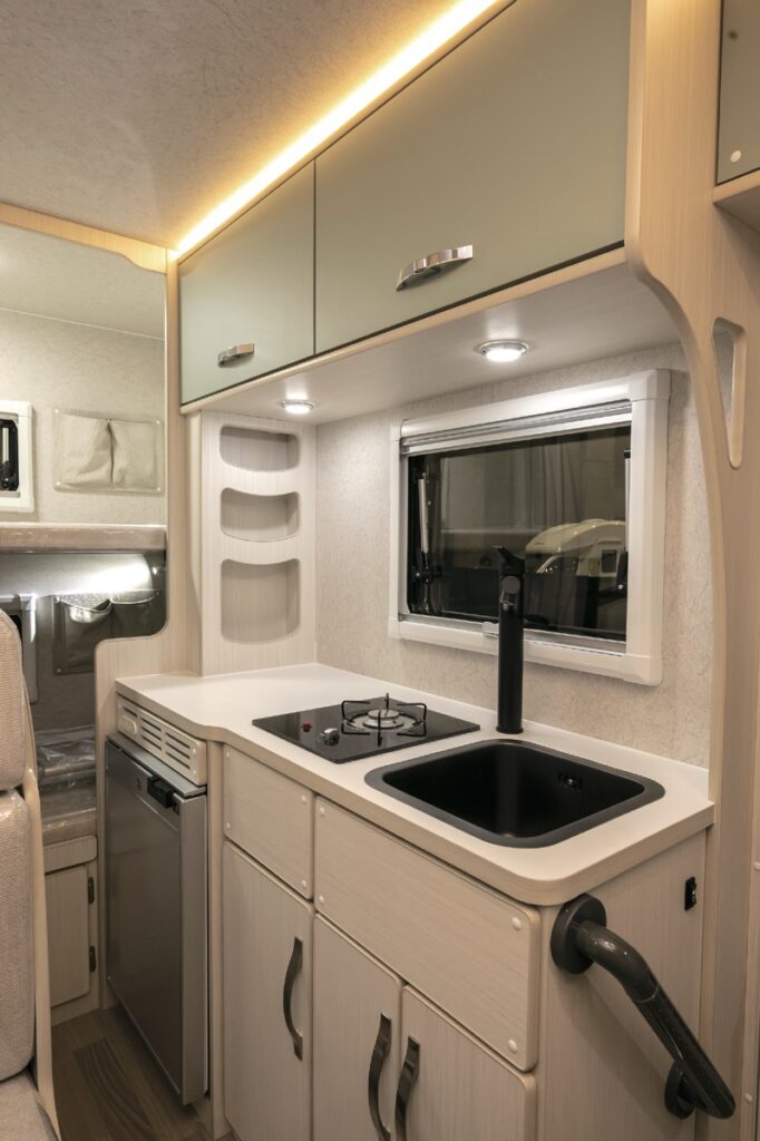 見栄えの良い1口コンロとシンクはライバル車に比べて特徴的。80ℓ冷蔵庫と20ℓ給排水タンクは標準装備。