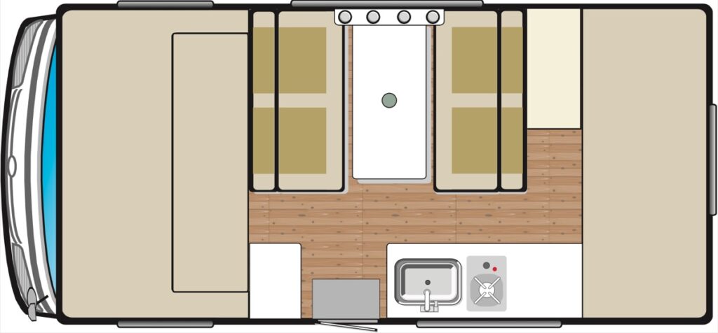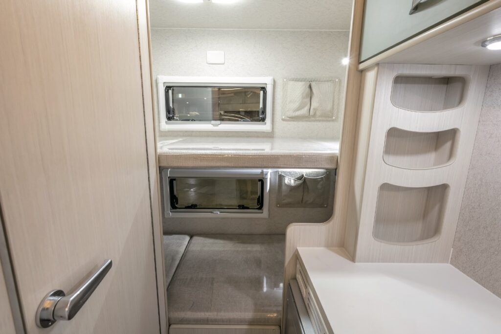 現行の普通免許取得で運転できるのは車両総重量3.5tまで。オステリアは、そのサイズと車重カテゴリーに対応し、全幅は何と1920mmにまで抑えている。しかしその内容は、6人乗車6人就寝のファミリータイプ。ボディサイズだけをみれば、全長と全幅はミニバンと同程度なので、運転のしやすさや、取り回しといった点でも、不自由を感じるようなことはない。室内は明るい雰囲気にまとめられ、間接照明にLEDを使いスッキリしている。平面を生かした家具は見た目もスマートだ。