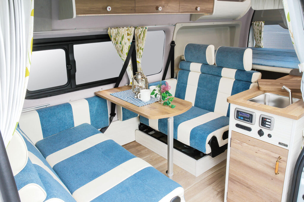 カフェのような内装が魅力のナチュラルデザインシリーズのなかでも、このモデルは対面ダイネットを採用。リヤには横向きに寝られるハイマウントベッドがセットでき、フロアベッドと併せて家族4人が寝られるファミリー対応モデルだ。フロアは重歩行用の素材が使われている。