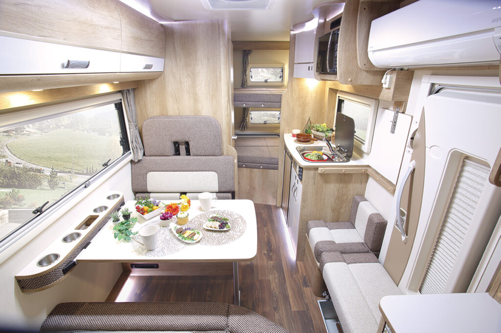 固定シートによる対面ダイネットはサイドに単座とステップ上に補助マットが置ける設計。大人4~5人でも余裕たっぷり。確実に進化を続けるエボリューションシステムによる余裕のバッテリー容量で、快適電化生活も可能。