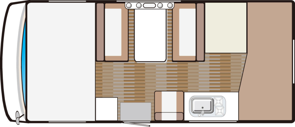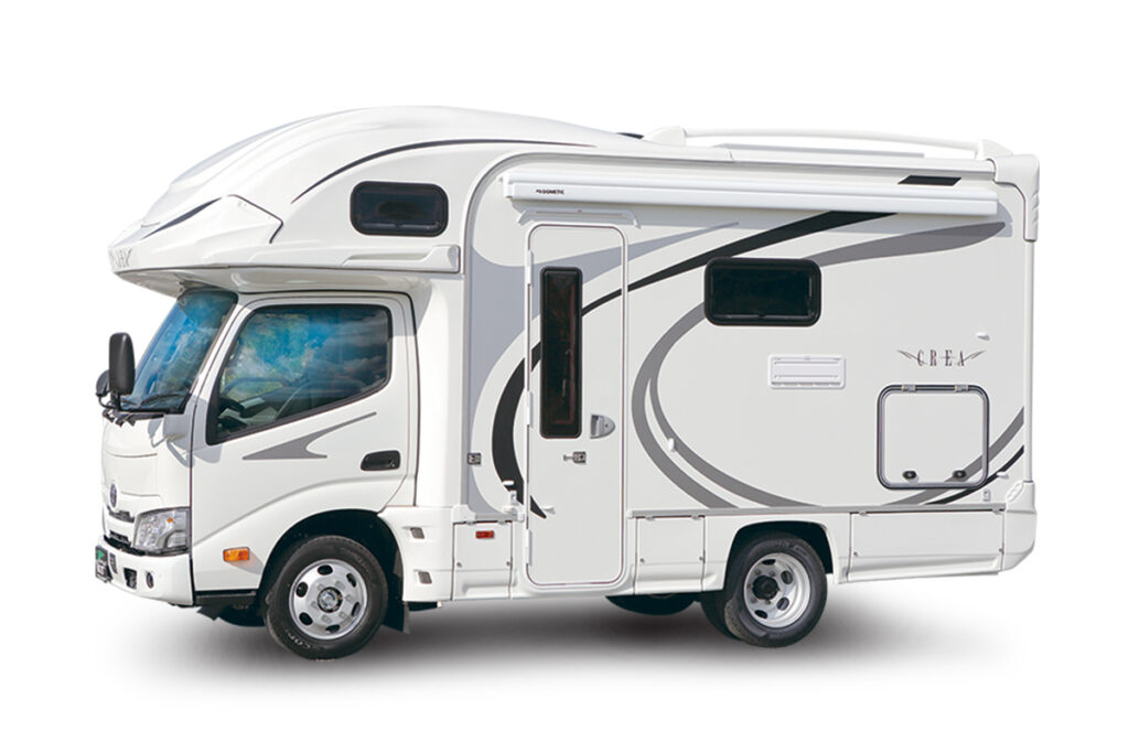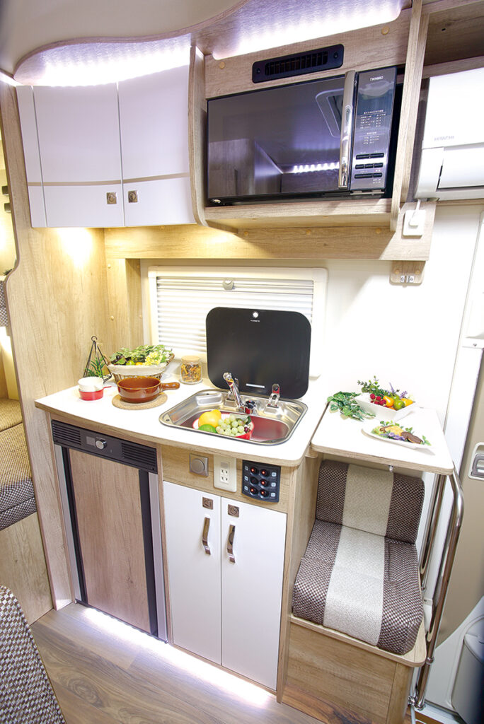 クレアには全長5.3mのフル装備仕様もあるが、それを5mで実現した。レイアウトは定番のリヤ常設2段ベッド。
