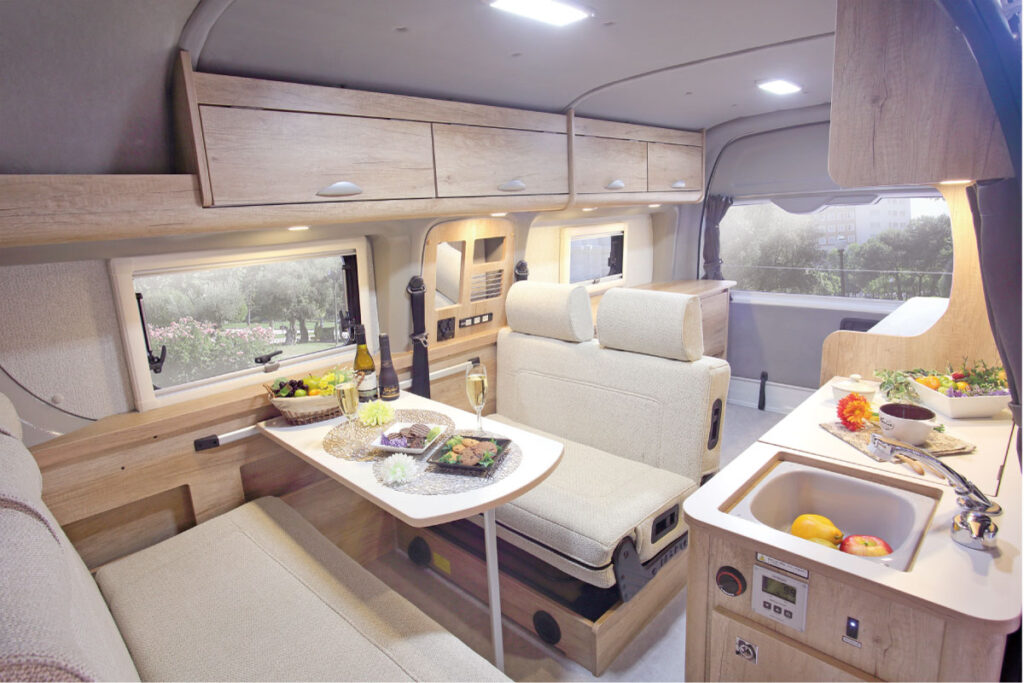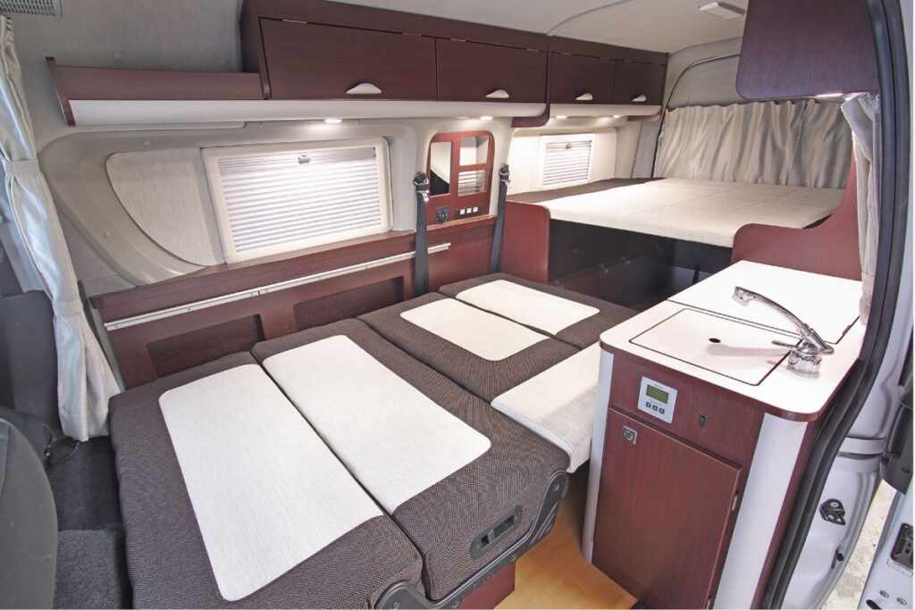 これまでは車両後部に配していたキッチンと冷蔵庫をスライドドア横に移し、上段ベッド展開時でもこれらが使用可能になった。