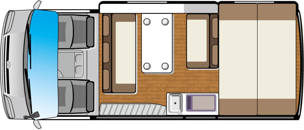 | 標準装備 | カセットコンロ/100Ah鉛サブバッテリー/13ℓ給排水タンク ほか |