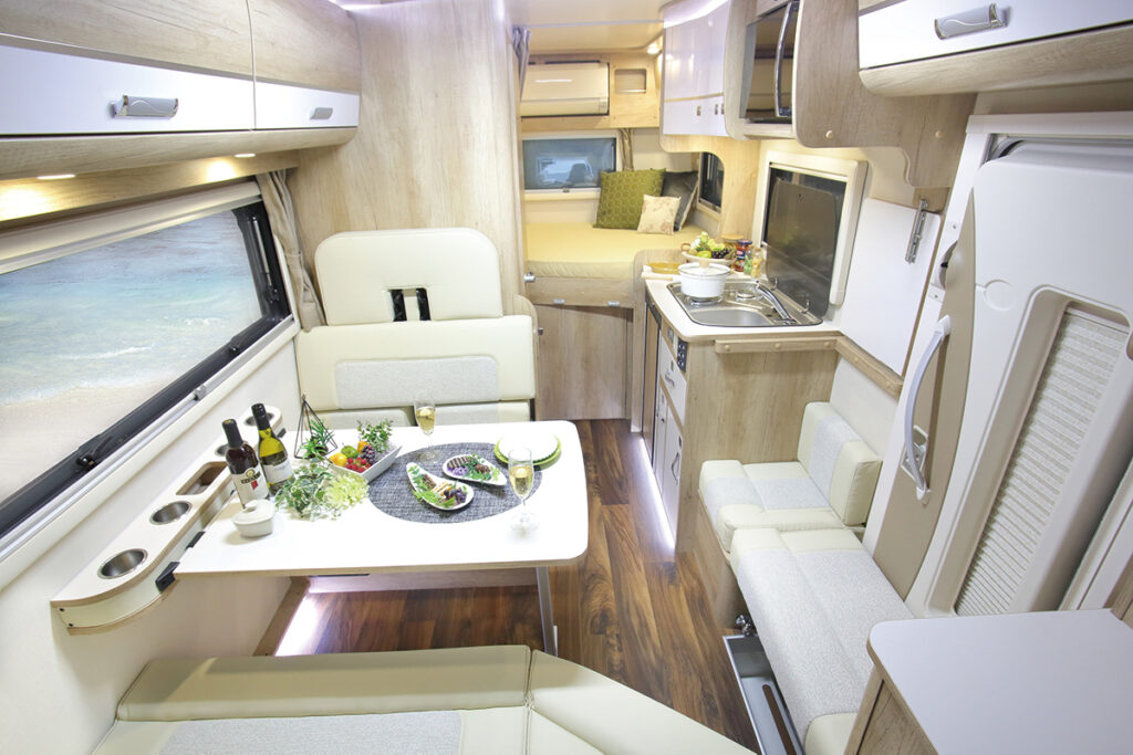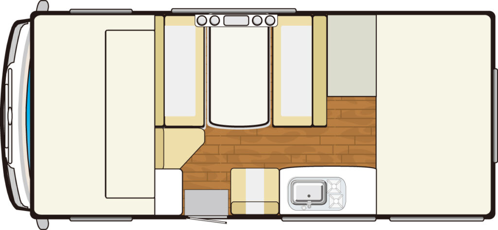 走行時の空気抵抗が少ないバンクベッド形状を採用。普段はほぼ収納スペースとなるであろう2人旅のニーズを想定して生まれたフォルム。ただし、いざとなったらゲストベッドとして十分機能するサイズ。リヤに常設セミダブルベッドを持ちながらマルチルームがあるのも評価できる。