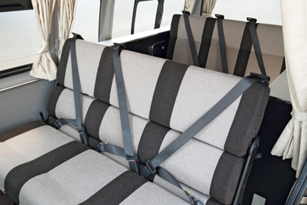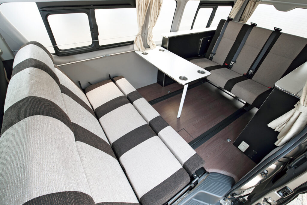 車名の540はスーパーロングの全長の約5.4mに由来。タイプ2は多人数乗車に対応する3列シート仕様。ミニバンと同様に全席で前向きに乗車でき、ダイネットやベッドへの展開も簡単だ。2650mmのスーパーロングスライドレールに、REVO ST 1400mmセカンドシートと、T-REVO 1200mm幅サードシートを搭載する。