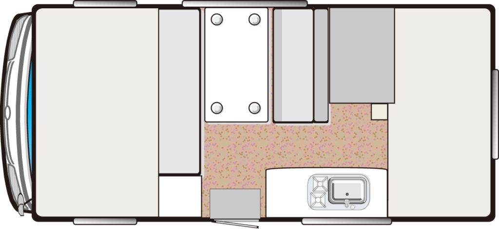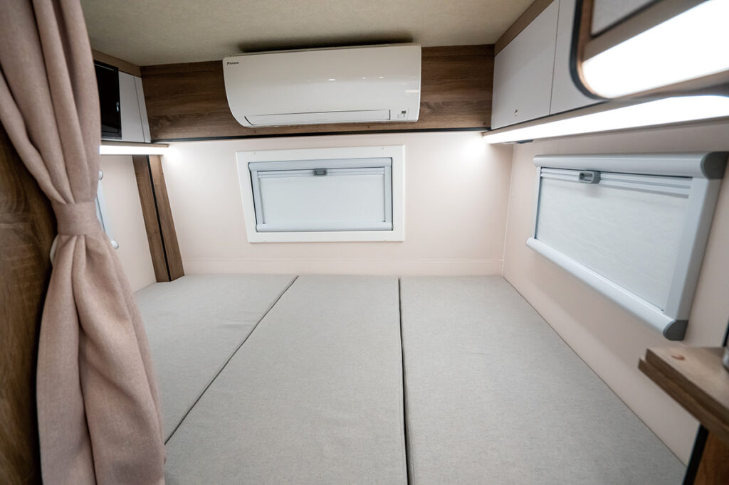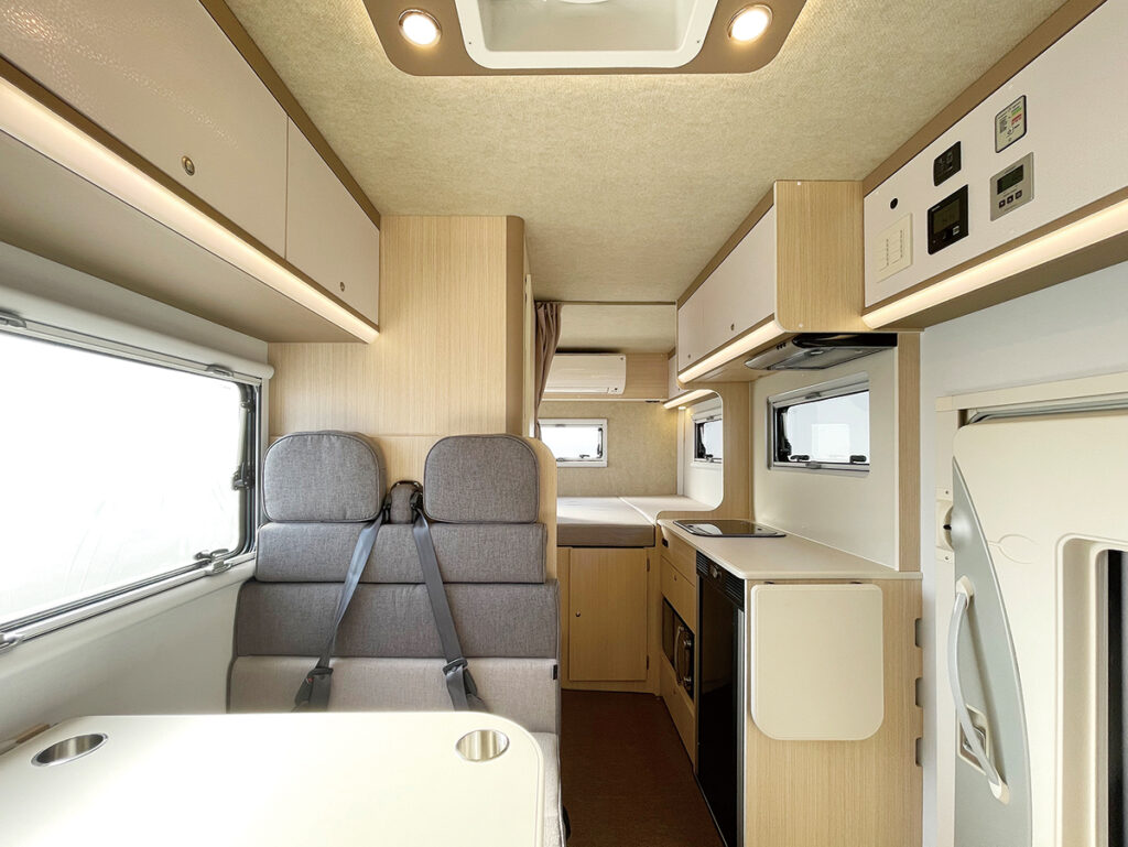 FRP成型のシェルからパネル工法に変更して全長を拡大。空力にこだわり、バンクベッドの張り出し形状を新たに成形したほか、収納力を徹底的に高めた。ルームエアコンを標準装備し、室外機下空間もデッドスペースとせず、外部収納庫として活用するなど大幅に進化。就寝部も充実している。