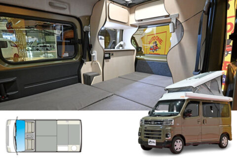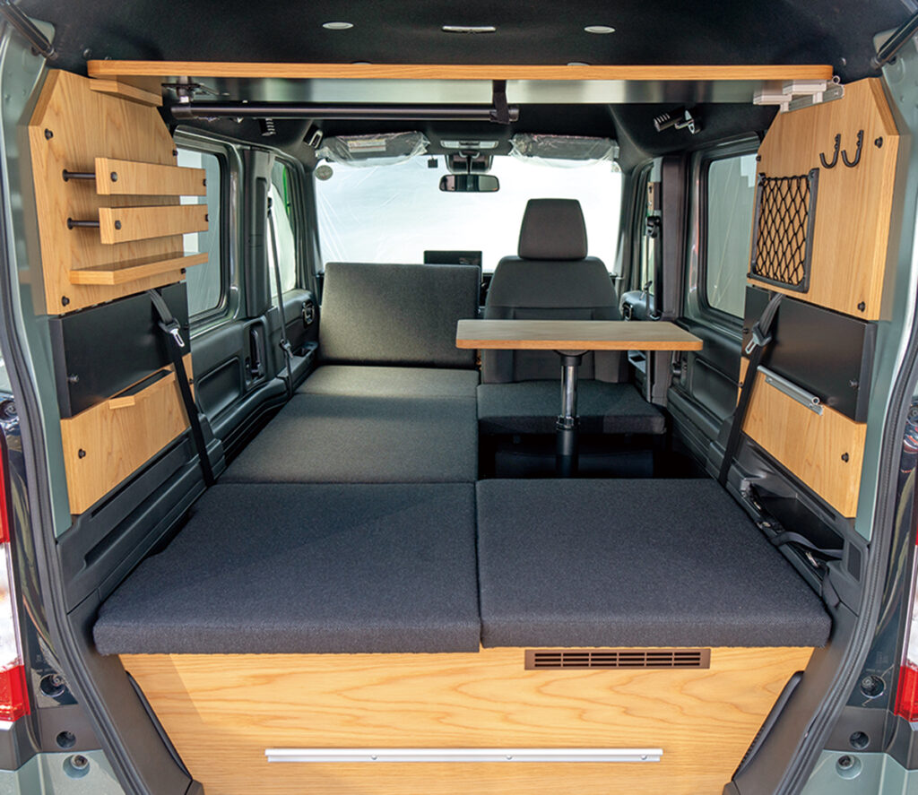 注目はマルチウェイロングテーブルで、バックドアに取り付けてダイネットテーブルになるほか、荷室左右の壁に橋渡せば就寝時のテーブルとしても使える。また最上部にセットすれば荷物棚にもなる優れもの。