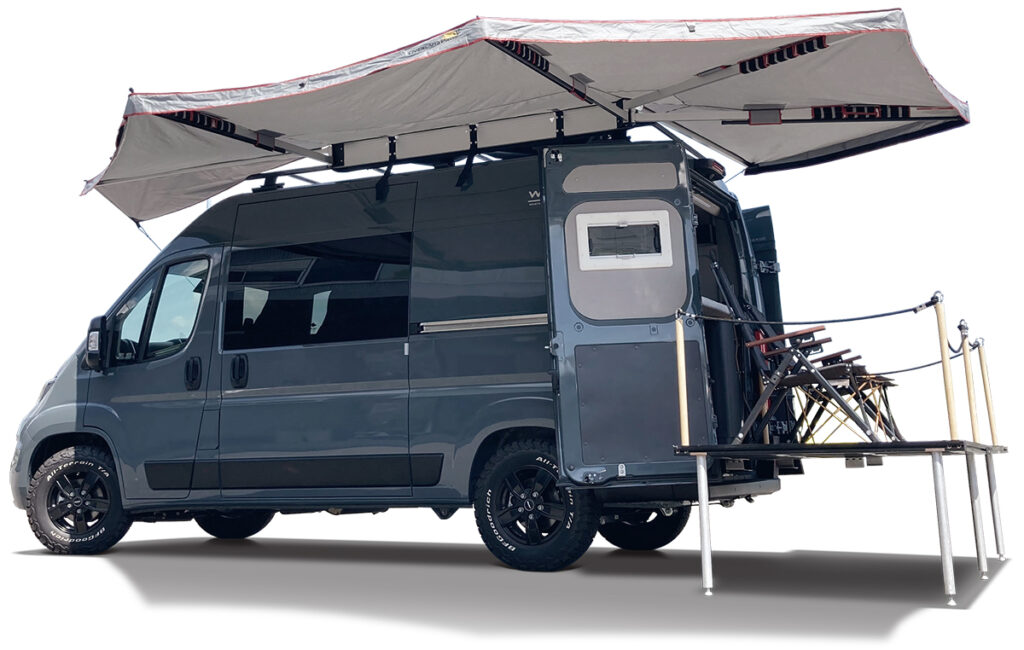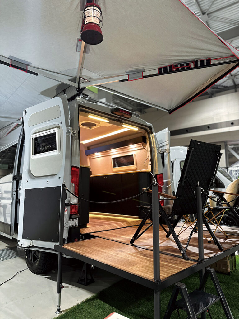 フロア・ボードがテラスにトランスフォーム! バックドア側に内蔵されたスライド式フロアボードを引き出すと、ダイニングテラスやデッキテラスとして利用できる。インテリアとエクステリアの垣根をなくすユニークな発想をカタチにできたのは、観音開きのバックドアが備わるデュカトならでは。