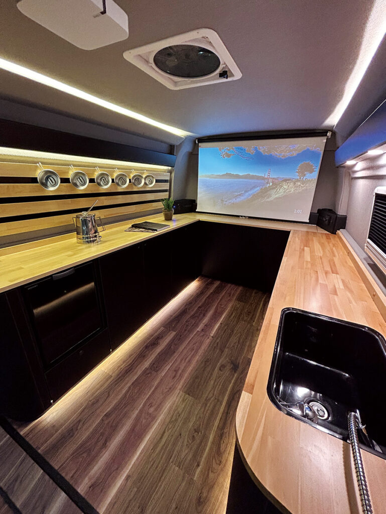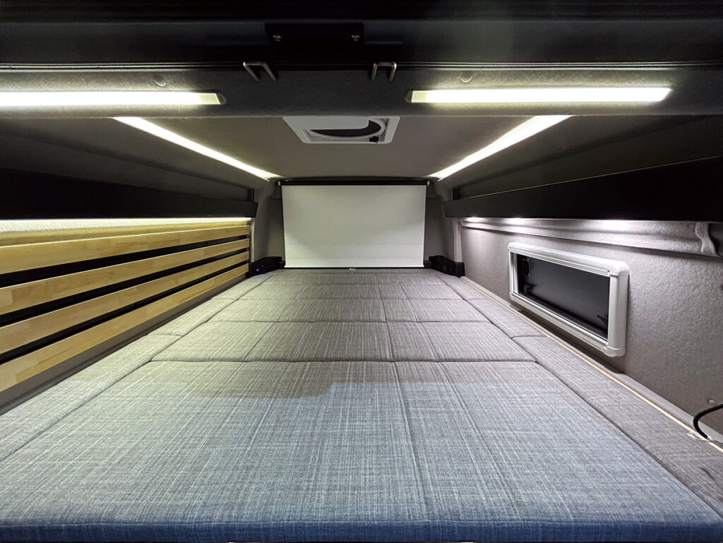 キャビンスペースとカーゴスペースはパーテーションで仕切られ、写真のようにスクリーンにプロジェクターを投影することもできる。フルトリムやアクリルで断熱対策は万全。