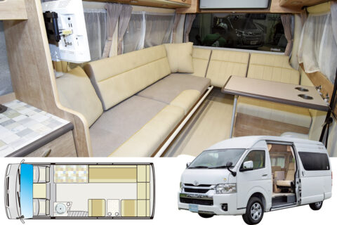 | 標準装備 | シンク/シャワーフォーセット/19ℓ給排水タンク/電子レンジ/18ℓ冷凍冷蔵庫/100Ahサブバッテリー/1500Wインバーター/バックモニター/REVOシート ほか |