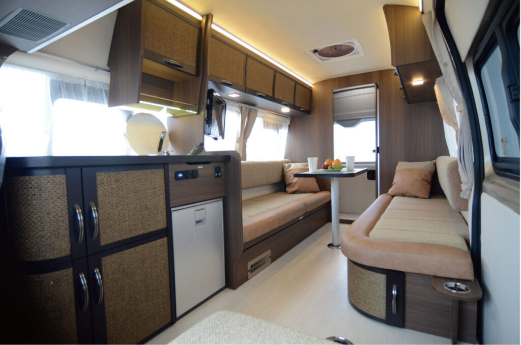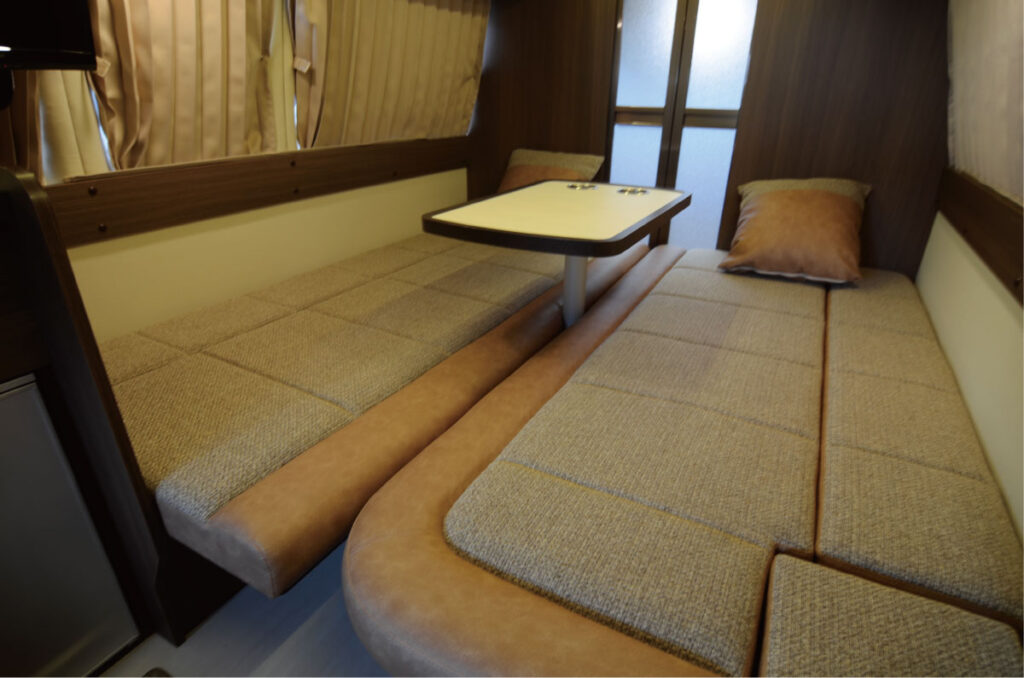 ダイネットは、ニの字の横座りシートとカップホルダー付きテーブルで構成。