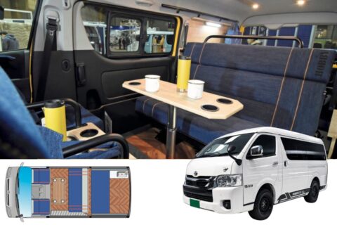 レクビィのハイエースバンコン「ソラン」は、ペットといっしょのクルマ旅を想定した装備内容とレイアウトが特徴。シンクとキッチンをフロント側にまとめ、スライドドア部分のスペースを広げてケージ置き場に使えるようにした。