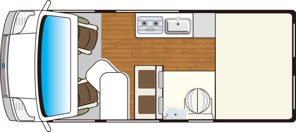 | 標準装備 | 2口コンロ/1ウェイ・84ℓ冷蔵庫/90ℓ給排水タンク/DC12Vクーラー/FFヒーター/トイレ(カセット式)/105Ah鉛サブバッテリー ほか |