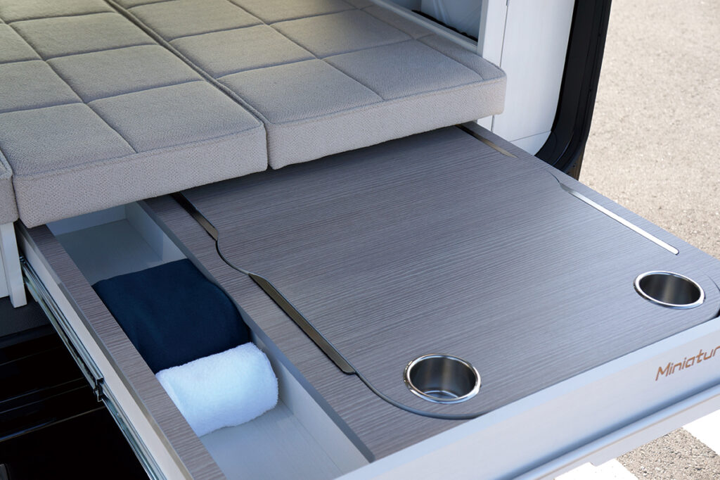 「ミニチュアクルーズ」は2013年デビューのロングセラー。2019年に初のマイナーチェンジを敢行し、家具の部材を見直すことで従来比30%の軽量化を達成。また、家具の工法も変更し強度もアップ。寝心地にこだわったベッドや収納力のあるキャビネットなども健在。