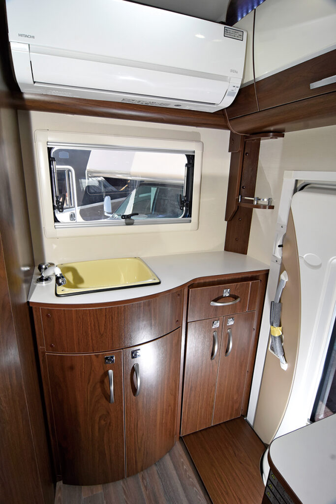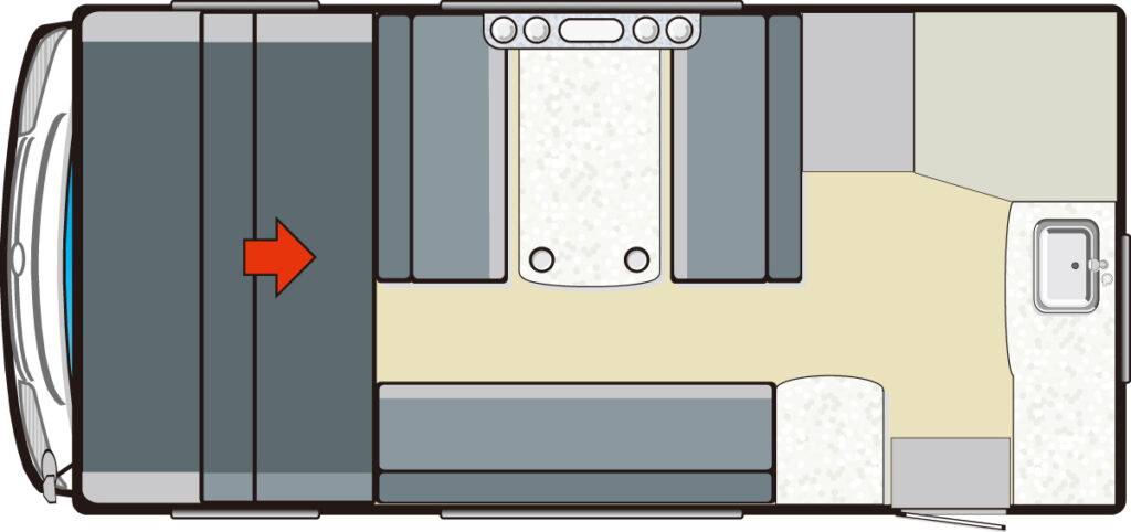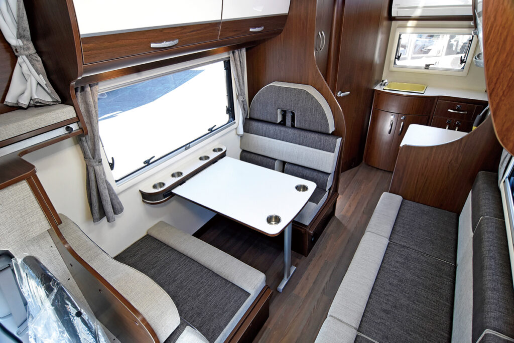 リヤエントランスならではの開放的なダイネットを採用。ファミリーユースで使うには最適な設定といえる。走行充電装置を独自のシステムにして大容量サブバッテリーを安定的に、効率よく満充電にできる。搭載されるルームエアコンの室外機をフロア下に設置しており低重心化を実現。