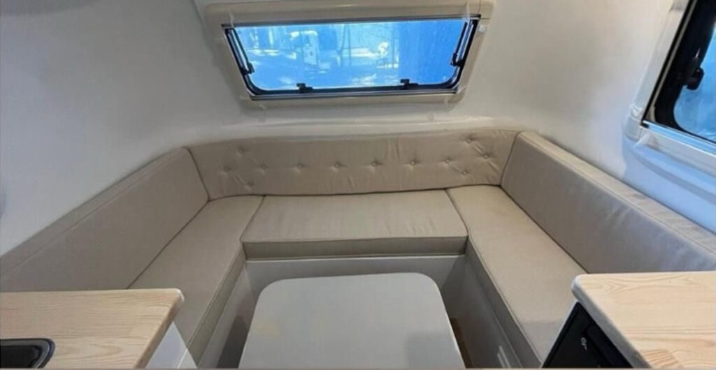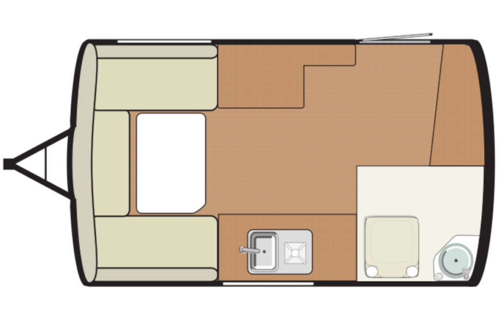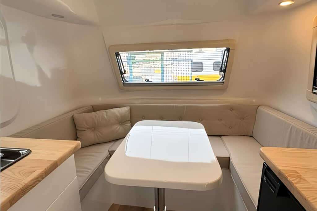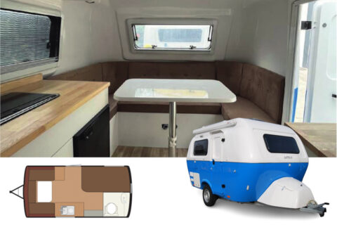 フロントにダイネットがあり、就寝時はここがベッドとなる。小さいボディだがキッチンやマルチルームも用意されていて、2人なら快適に過ごせる。