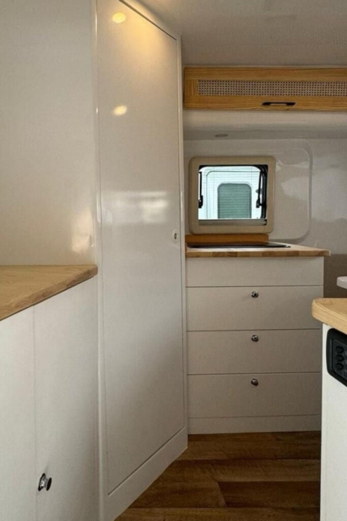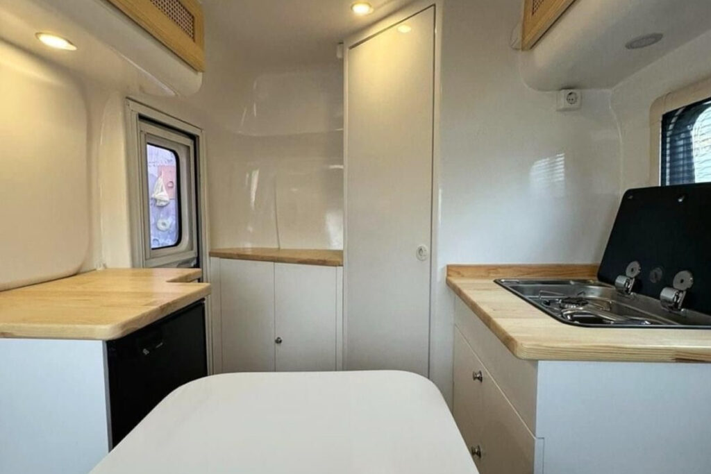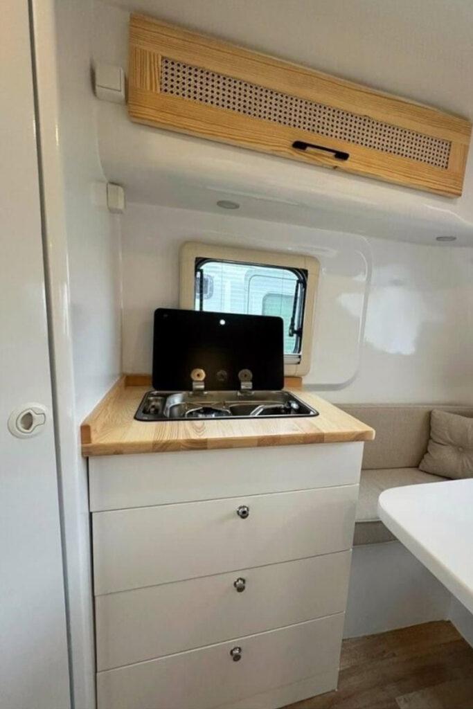 キッチンにはシンク一体型の1口コンロが備わっている。キッチン上部のデッドスペースもFRPで作られているが、キッチン天板や収納庫の扉に天然木を採用することで、無機質になりすぎず家庭的な雰囲気を作り出している。