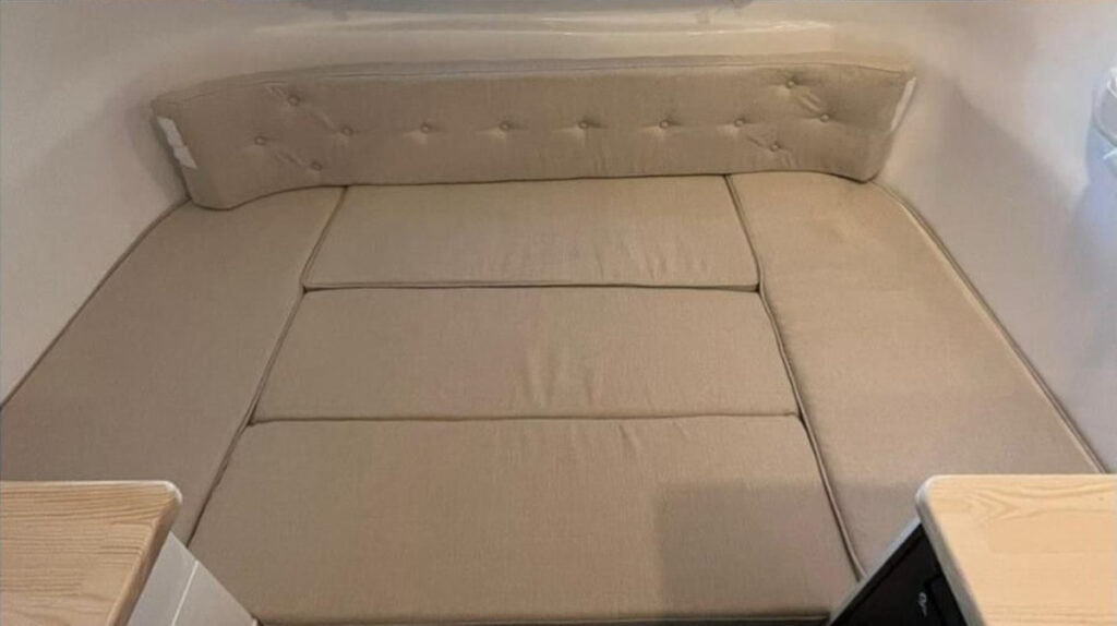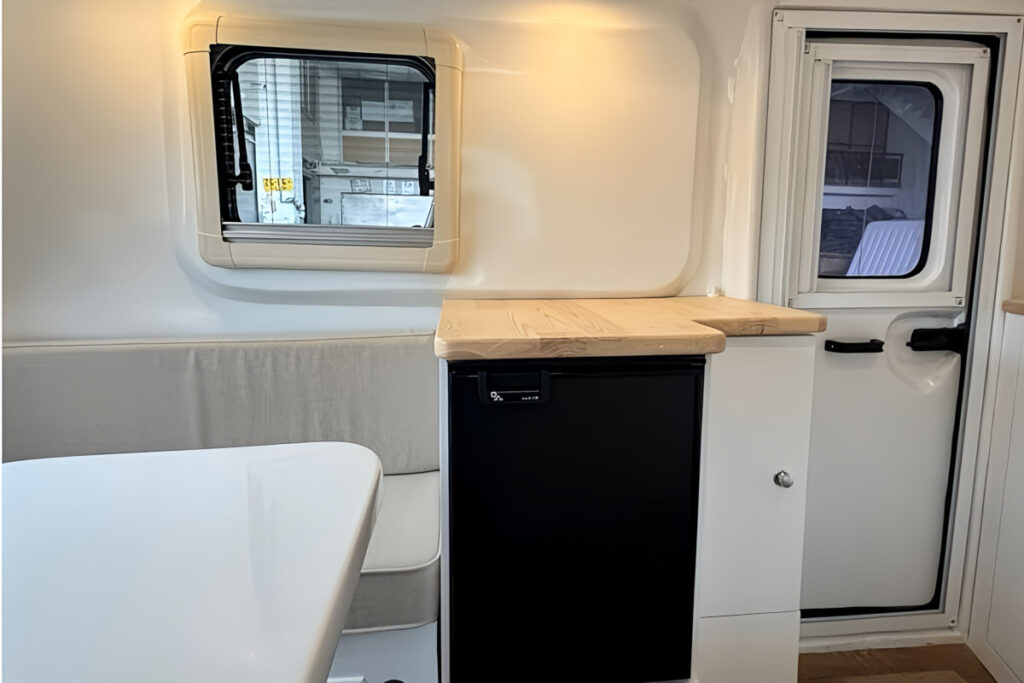 フロント側にコの字のダイネットが用意されており、就寝時はここが展開してベッドになる。小型でも室内高は191cmあり、背の高い人でもゆとりを持って過ごせる。