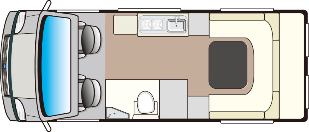 | 標準装備 | シンク/2口コンロ/100ℓ給水タンク/90ℓ排水タンク/140ℓ冷蔵庫/サブバッテリー/トイレ(カセット式)/FFヒーター ほか |