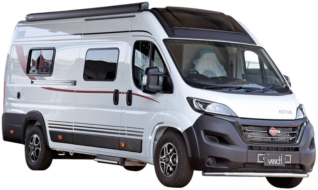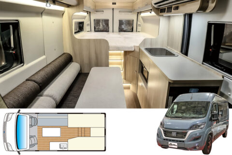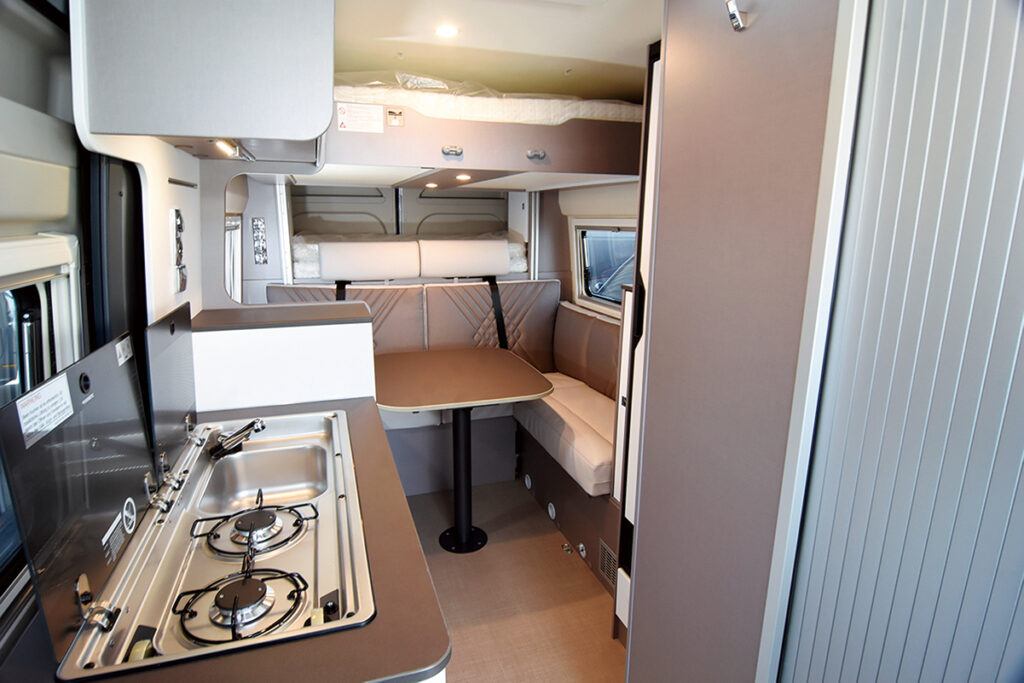 欧州バンコンでは反転させたフロントシートとセカンドシートでダイネットを形成するのが一般的だが、このモデルは室内中央にキッチンとシャワー&トイレルーム、後部にコの字ダイネットを配置。独創的なレイアウトで、ゆとりある空間を作り出している。