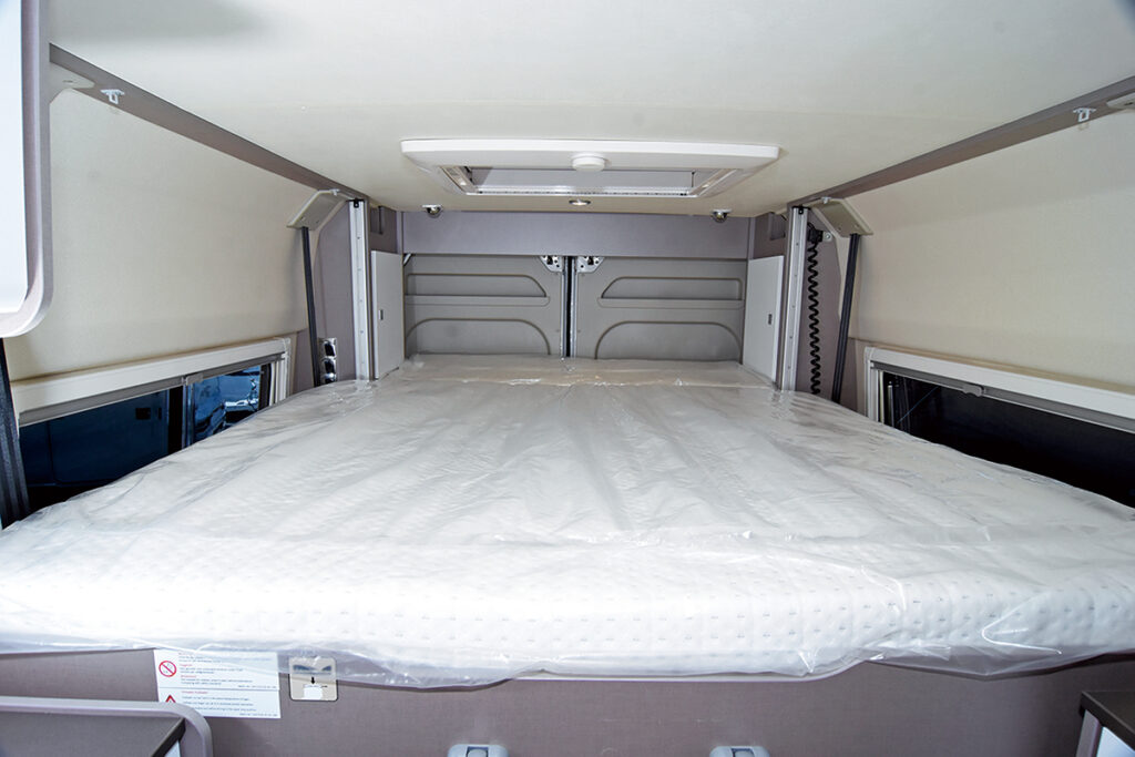 後部に長さ2080×幅1500mmのプルダウンベッドを装備した上下2段構造で、大人4人がゆったり就寝できるのもポイントだ。ファミリーユースにも対応する。