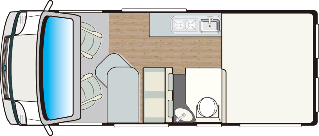 標準装備 ボイラー&ヒーター(LPガス)/3ウェイ・84ℓ冷凍冷蔵庫/シンク/2口バーナー(LPガス)/100ℓ給水タンク/90ℓ排水タンク/トイレ(カセット式)/95Ah鉛サブバッテリー/ ほか